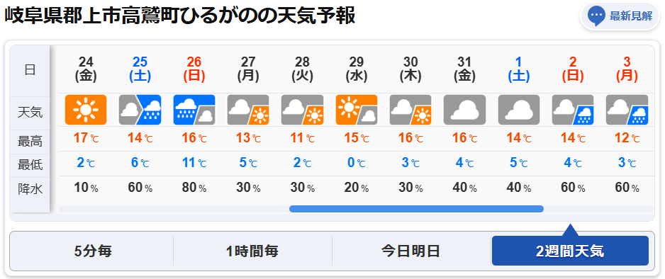 10/24現在の天気予報と気温を添付しておきますのでご参考にしてください。