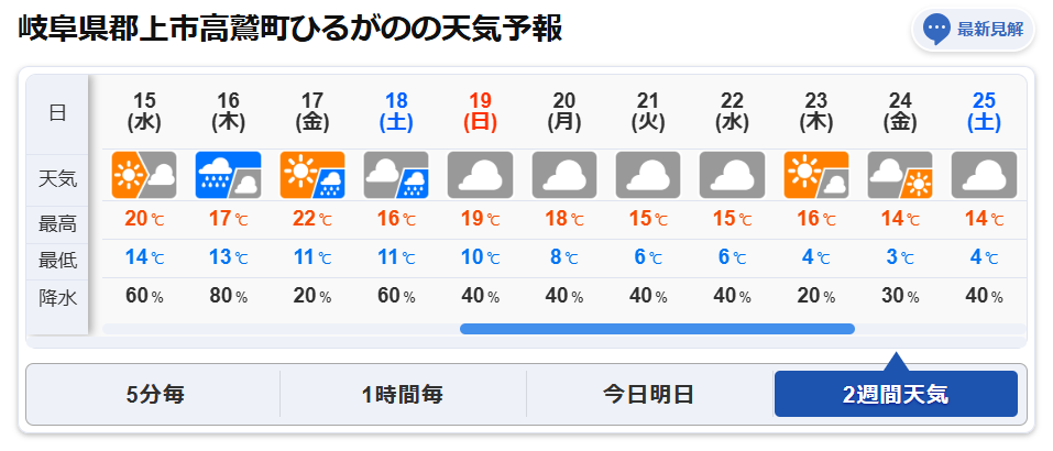 10/15現在の天気予報と気温を添付しておきますのでご参考にしてください。